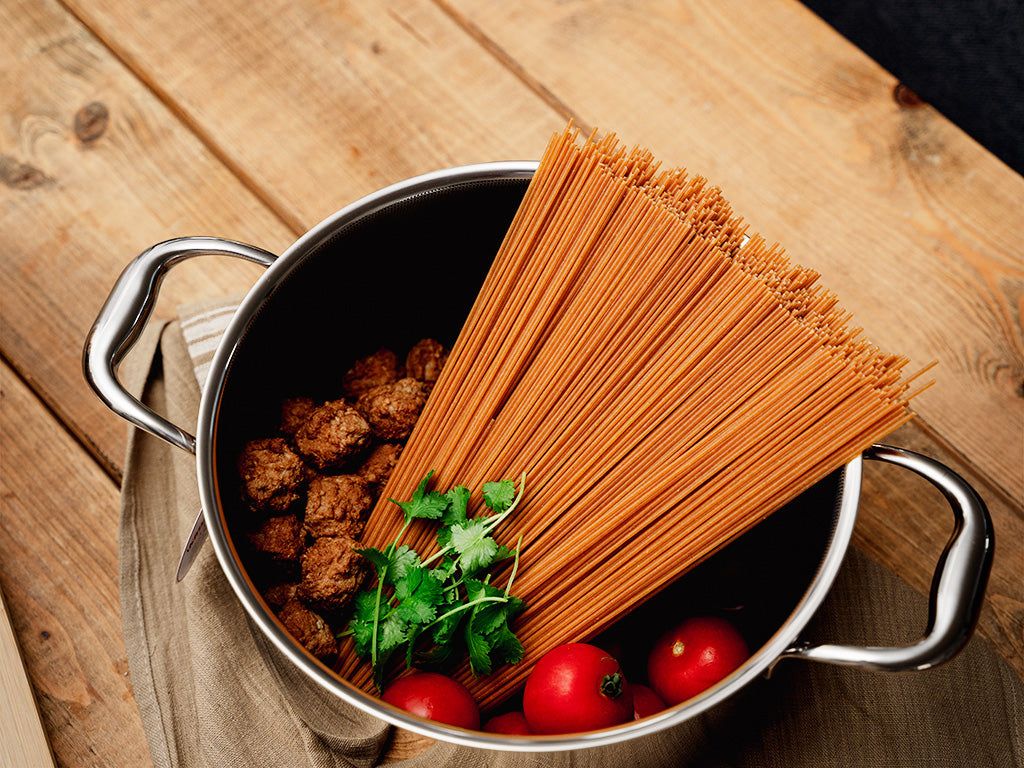 Maar hier onderscheidt ons kookgerei zich echt van de rest - hoewel onze pannen en sauspannen anti-aanbak zijn, zullen ze je vlees of groenten absoluut perfect aanbraden, bakken of braden. Veel eenpansgerechten vereisen dat je eerst wat groenten of vlees aanbraadt of bruin maakt. In een gewone pan is dat gewoon een verschrikkelijke ervaring - en velen kiezen ervoor om in een aparte koekenpan aan te braden of te bakken. Er is ook de frustratie van het wachten tot een grote pan water kookt - of het nu voor pasta of eieren is. Het voelt alsof het een eeuwigheid duurt, en er is niets erger dan steeds naar het fornuis te moeten gaan en te controleren of het water kookt - irritant, toch? Dit is nog een probleem dat we voor jou hebben opgelost!