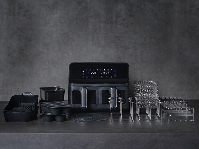 Onze ONYX COOKWARE™ AIRFRYER biedt dubbel plezier! Met twee aparte frituurpannen kun je twee verschillende gerechten tegelijk bereiden of de gerechten apart bereiden, waardoor je kooktijd gehalveerd wordt!