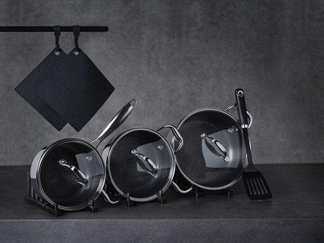 Wat onze producten echt onderscheidt van je gewone potten en pannen, is het unieke laseretsproces dat het gepatenteerde ONYX COOKWARE™ hexagon-ontwerp creëert. Dit unieke proces creëert een reeks pieken en dalen op het kookgerei. In het dal bevindt zich het anti-aanbakmateriaal, zodat je die anti-aanbakeigenschappen en gemakkelijke reiniging krijgt. Een van de pieken die je krijgt, is het roestvrij staal, dat duurzaamheid, perfecte afdichting op je vlees en de mogelijkheid om metalen gebruiksvoorwerpen en gereedschappen te gebruiken biedt. Daarom noemen we onze potten en pannen "hybride". Ze bieden je het beste van twee werelden: de anti-aanbakeigenschappen die we allemaal willen in ons kookgerei en de duurzaamheid van een professionele roestvrijstalen of gietijzeren pan.
