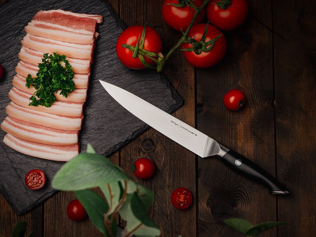 Het ONYX COOKWARE™ VLEESMES is essentieel bij het snijden en carven van vlees. Het VLEESMES is dunner en slanker dan een KOKSMES, waardoor het mes gemakkelijker door vlees kan snijden en rond botten of kraakbeen kan manoeuvreren. Een goed VLEESMES kan het verschil zijn tussen schone, smakelijke plakken vlees en rafelige, droge sneden.