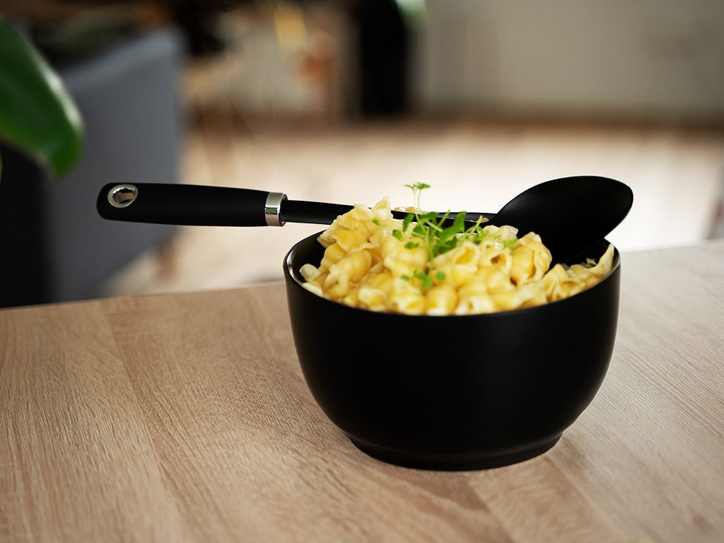 De ONYX COOKWARE™ VASTE LEPEL is de nieuwe allrounder voor uw keuken! Het hoogwaardige roestvrij staal met de afwerking van glad zwart titanium valt direct op. Het strakke uiterlijk is bovendien niet alleen voor de show: deze keukenlepel is extreem duurzaam en garandeert jaren kookplezier.