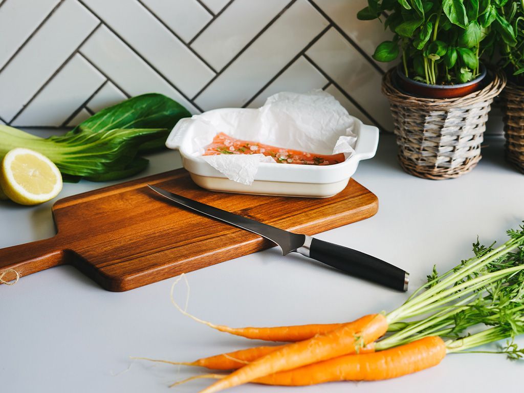 Vis schoonmaken en fileren is niet te vergelijken met het doorhakken van harde botten en vlees. Fileren is delicaat werk dat handvaardigheid vereist, en waar een speciaal fileermes voor nodig is. Het lemmet moet flexibel genoeg zijn om te kunnen buigen, zonder te breken. Schaf daarom het FILEERMES van ONYX COOKWARE™ aan. Omdat vis zachter is dan biefstuk of ander rood vlees, moet u minder kracht uitoefenen bij het snijden en schoonmaken. Daarom hebt u een precisiemes nodig in plaats van een log koksmes dat is ontworpen voor stevige vleessoorten.