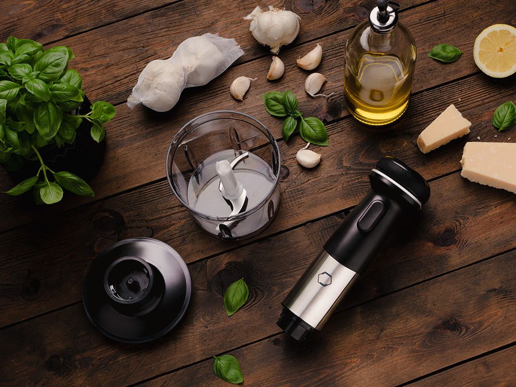 Maar hoe werkt het? De ONYX COOKWARE™ DRAADLOZE STAAFMIXER is zo ontworpen dat hij zo eenvoudig mogelijk is. De staafmixer kan eenvoudig worden gedemonteerd en bevestigd aan de hakmolen of de garde, wat je een naadloze ervaring geeft tijdens het koken. Moet je uien hakken? Voeg de uien toe aan de hakmolen, bevestig de mixer, hak een paar seconden en je bent klaar om te gaan. Of misschien moet je eieren kloppen en haat je het idee van handmatig kloppen. Bevestig de garde aan de staafmixer, druk op de aan/uit-knop en laat de mixer al het werk voor je doen. Je kunt zelfs je eieren of slagroom in de beker kloppen en eersteklas slagroom en omeletten krijgen.