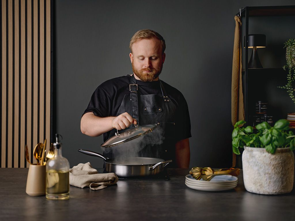 Dit wordt gedaan door middel van gecontroleerde stikstofhittebehandeling, een proces dat het staal versterkt en een fijne, duurzame textuur op het oppervlak vormt. Het resultaat is wat wij nano-texturering noemen; een fijn, bijna onzichtbaar patroon dat voorzichtig vermindert hoeveel contact uw voedsel met de pan heeft. Dit geeft de pan zijn natuurlijke anti-aanbak eigenschappen - zonder toevoeging van chemicaliën.